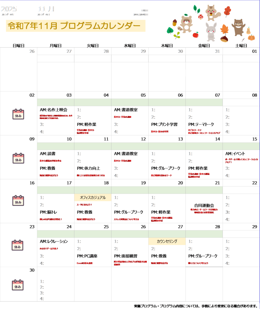 月に数回、同じ軽作業やグループワークプログラムがありますが