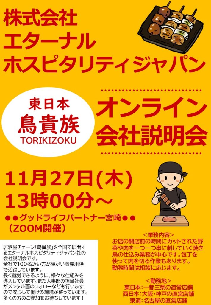 居酒屋チェーン「鳥貴族」を全国で展開するエターナルホスピタリティジャパン社の会社説明会です