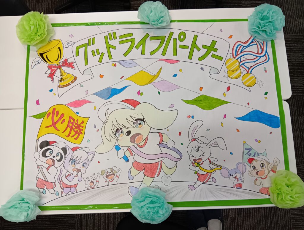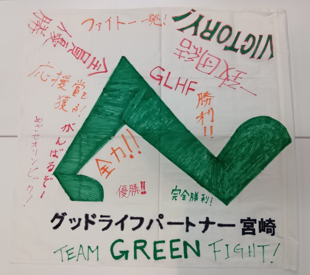 みなさんで当事業所のロゴと意気込みの一言を旗に書いて気合を入れました✌