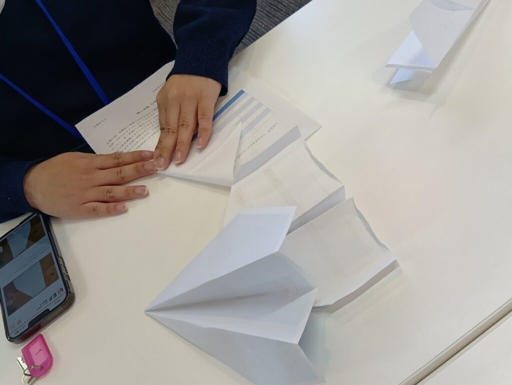 まずはそれぞれで紙ヒコーキ作りに挑戦し、折り方を工夫しながら自分だけの一機を作成しました。
